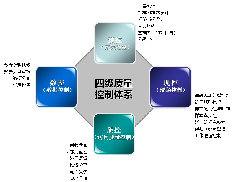 項目調查質量達到最佳,不僅是客戶的要求,也是課題研究的必要條件,因此萬人公司投入大量資源,構建了與眾不同的質量控制流程和體系,保證在任何項目環境下,項目均能得到有效可靠的質量保障,從而使調研的數據價值性得到加強。在質量控制上,萬人公司堅持四級質量控制,以保證項目每一個環節得到有效控制。