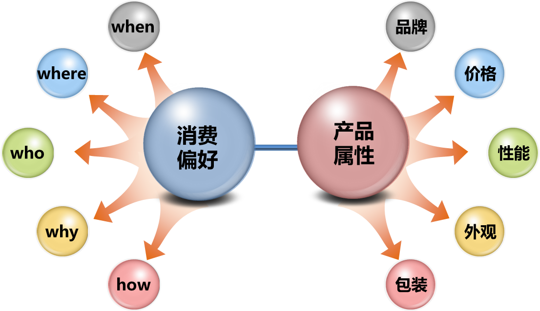 萬人調查從產品屬性及產品客群兩個方面來研究,構建了萬人產品研究模型。產品屬性方面,主要是研究產品本身自己的屬性,包括產品品牌、價格、性能、外觀、包裝等;消費偏好則從消費者的角度研究消費者對產品的消費行為及評價,包括消費時間、地點、為誰購買、購買原因、如何購買等。