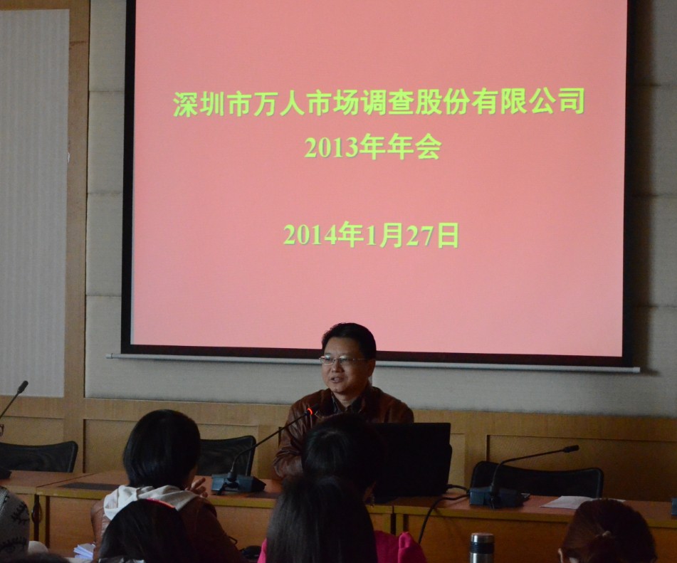 為總結今年工作,謀劃未來發展,12月27日,我們公司在榮生大廈會議室召開了2013年萬人市場調查股份有限公司年終工作會議,公司董事長何明龍先生、研究總監周群利,執行總監李香香女士、以及各個事業部總經理和全體員工參加了本次會議。