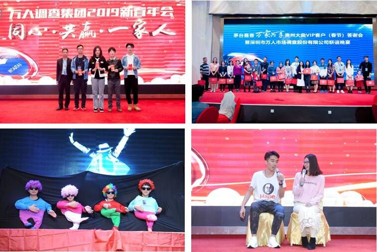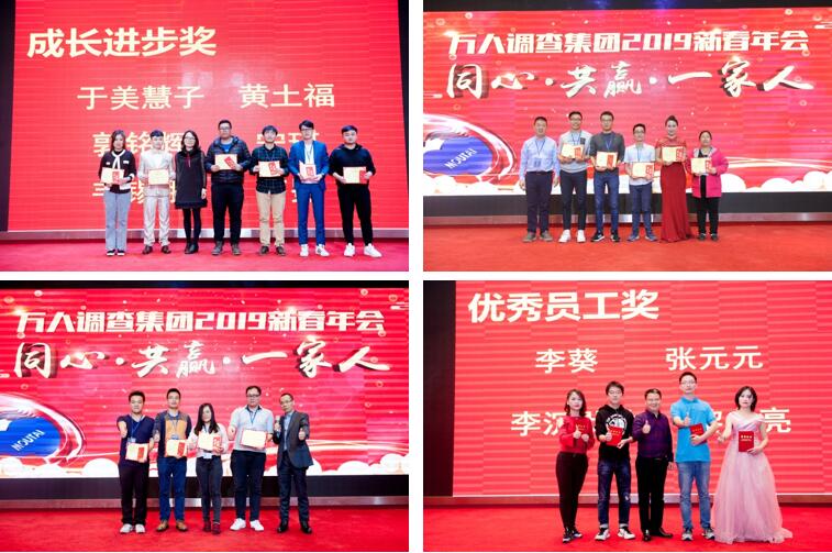 1月12日晚,萬人調查集團全體員工及部分家屬、重要合伙伙伴于云彩樓酒樓舉行了年度表彰大會暨2019年度的迎春晚會。在萬人調查這個大家庭中,員工多才多藝,年會上各個節目創意無限、精彩紛呈,有小品《辦公室的故事》、舞蹈《小人舞》、solo秀、情景劇《教你談戀愛》、歌曲《桃花朵朵開》、大合唱《相親相愛一家人》等等,精彩的節目為年會營造了一片歡愉熱鬧的氛圍。而隨著一份份的抽獎名單的公布,一份份豐厚的獎品給員工帶來的驚喜和溫馨,將年會推到了高潮,整個迎春會在和諧、溫馨、激情、歡樂的氣氛中圓滿落下帷幕。