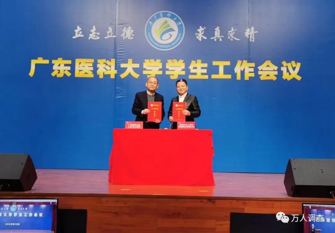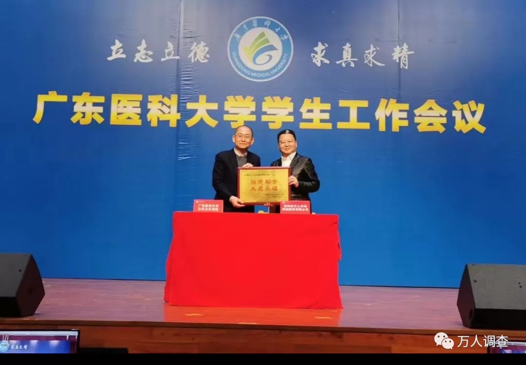 2020年12月31日上午11點在廣東醫科大學圖書館學術報告廳,隆重舉行了公共衛生學院—深圳市萬人市場調查股份有限公司“萬人調查獎學金”簽約儀式,未來三年我司將出資獎勵“品學兼優、勵志典范”的統計學專業在校本科學生,以激勵他們在校期間勤奮學習、刻苦鉆研、努力成才。此次“萬人調查獎學金”的設立,是自2020年疫情以來我司踐行社會責任的又一公益性項目。未來我司將繼續加強與廣東醫科大學公共衛生學院的深度合作,共同推動人才培養及教育事業的發展。