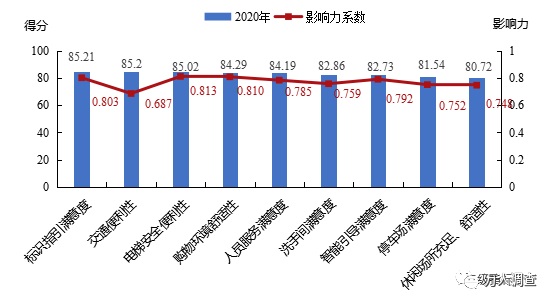 2020年標識指引滿意度得分較去年均有所增長,首次突破80.00分;但停車場(81.54分)和休息場所的充足、舒適性(80.72分)滿意度得分較低且備受關注,未來應重點改善。