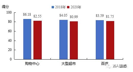 與2018年相比,三類業態2020年滿意度得分均有不同程度的下降,其中購物中心降幅較大,下降了3.63分,大型超市和百貨分別下降3.06、1.84分。