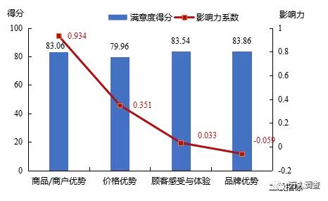 再結合影響力系數來看,商品/商戶獨特新穎性和商品/商戶種類齊全性影響力系數均在0.750以上,故提高這兩項指標的顧客滿意度對提升商品/商戶優勢的顧客滿意度最為有利。