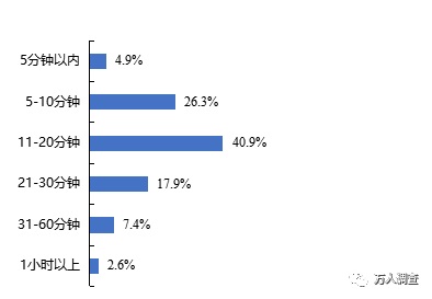 深圳居民購物單程時間主要集中在11-20分鐘(40.9%),總體來說,5-30分鐘的路程時間占比達85.10%。